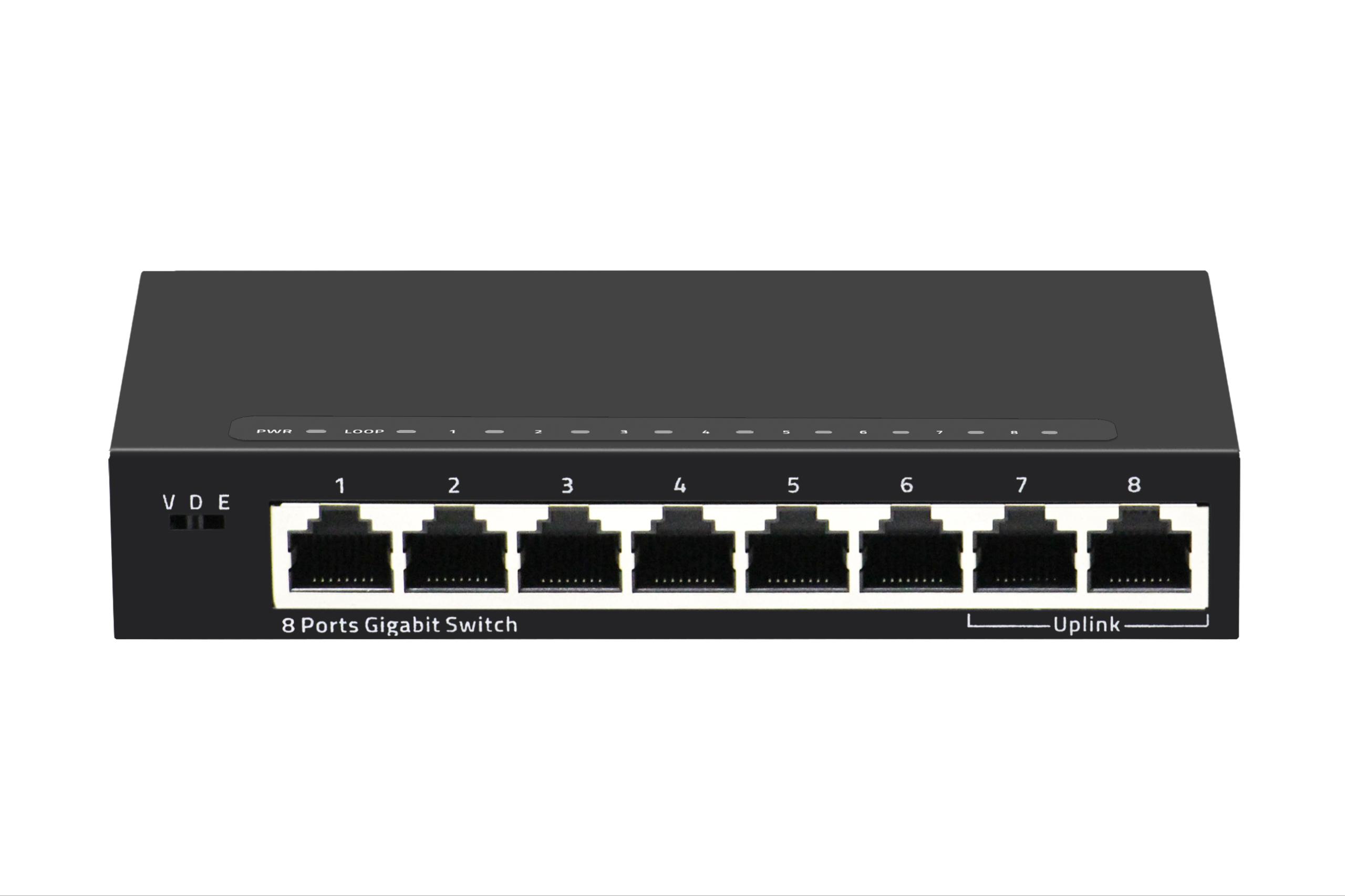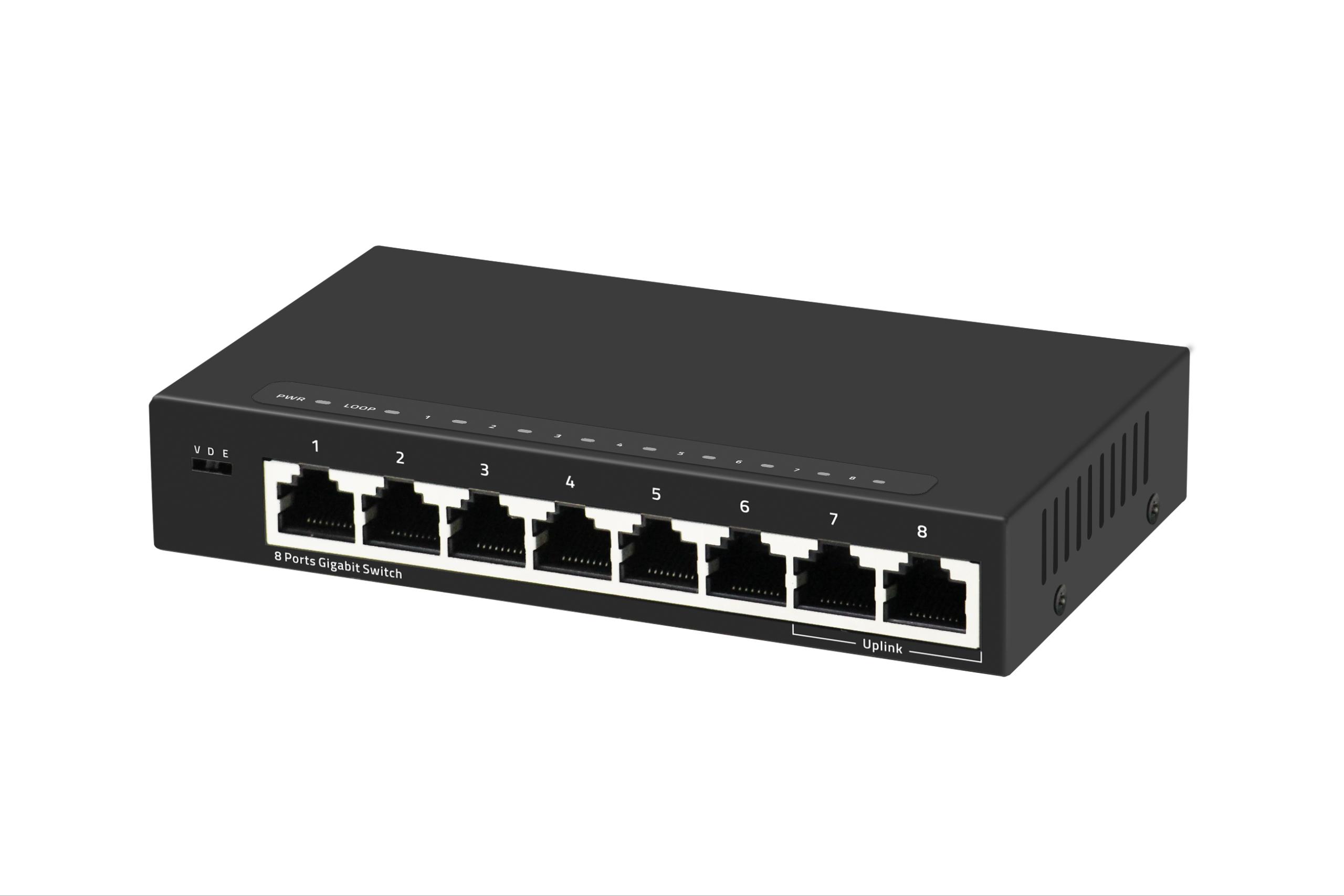 The 8-port Gigabit intelligent Ethernet switch adopts high-quality and high-speed network ICs, and this product completely solves the problem of noise of small switches in the office environment through the fanless mute design. This switch has 8 Gigabit RJ45 ports, can provide seamless connection for 10/100/1000M Ethernet, supports three working modes, one-key smart simple switching working mode, easy to manage and maintain, the product can be widely used in Security network video surveillance, hotel, campus, small and medium-sized enterprise network engineering and other occasions.